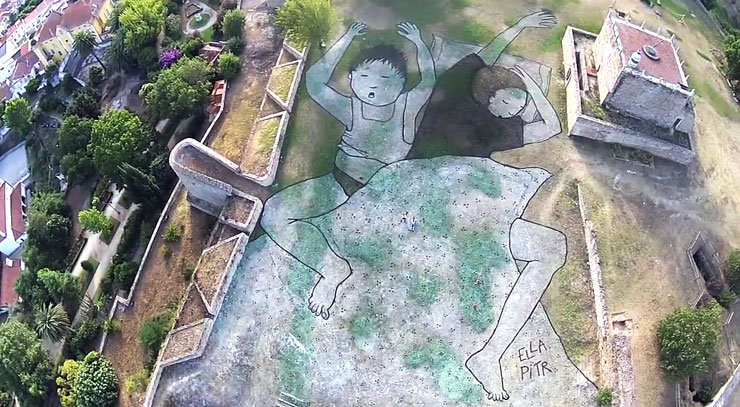 This one soars with a poetry that is sweet, but not saccharine. The rather astonishing French pair Ella and Pitr compile here their enormous drawings that can only be appreciated by birds, people in planes or hot air balloons, and of course, drones. “PAR TERRE” (by Earth) created this compilation of images while traveling to Chile, Portugal, Canada, and France over the last two years. Their materials are water-based ink, coal, chalk, and lime. And their feet.