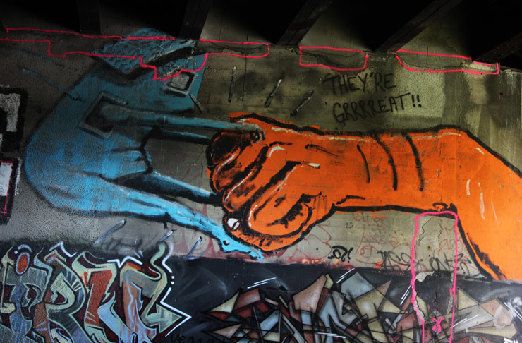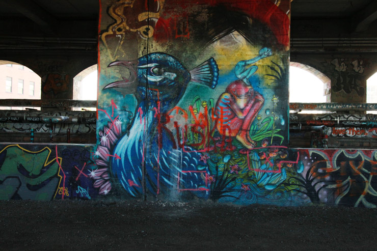 It’s not all about the murals! A sacrilegious thing to say perhaps, especially on a Sunday, especially when we are in town to see fresh new murals at the Wall\Therapy festival in Rochester. But none of the artists will take us to task because everyone knows that the roots of Street Art and graffiti are in the un-permissioned work that happens underground in hidden spots that become revered; magnets for aerosol mark-making, veritable spray can galleries. These crumbling houses of the holy are foundational to the modern Street Art scene. After all, if the good Lord didn’t want teens to get high, have sex, and catch tags he wouldn’t have created urban decay.