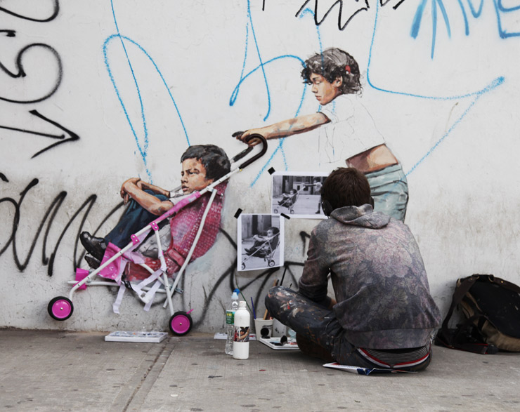 Lithuanian Street Artist Ernest Zacharevic is sitting cross-legged on a sidewalk in Bushwick, a neighborhood in Brooklyn that is rapidly changing – at least that’s what real estate interests have banked on. On a typical weekday you will see many families struggling to keep the bills paid, more carefully selecting food and household items from the stores along Broadway and Graham Avenue and Metropolitan than in previous years – many just balancing their payments, others falling behind. Here on a graffiti tagged wall Zacharevic is painting with brushes to bring Cooper’s 37 year old photo from Manhattan to life in Brooklyn.