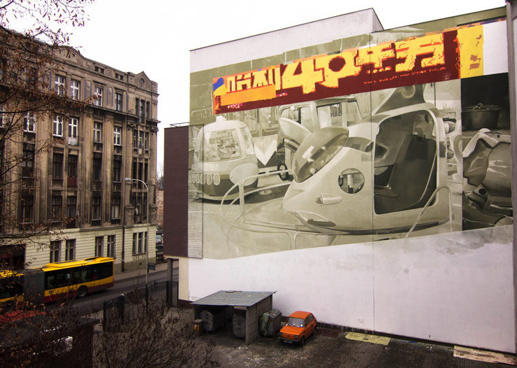 “The Japanese typography on the top of the piece is taken from an advertisement for the 40th anniversary of the invention of Walkman in Japan,” says Lodz Murals Michał Bieżyński, “I guess that everybody could tell their own story and should interpret it in their own way. I really like the piece because it’s not something obvious, not something easy to recognize. I hope that at least part of the audience will stop and think, ‘Hey, what’s going on here?’ ”