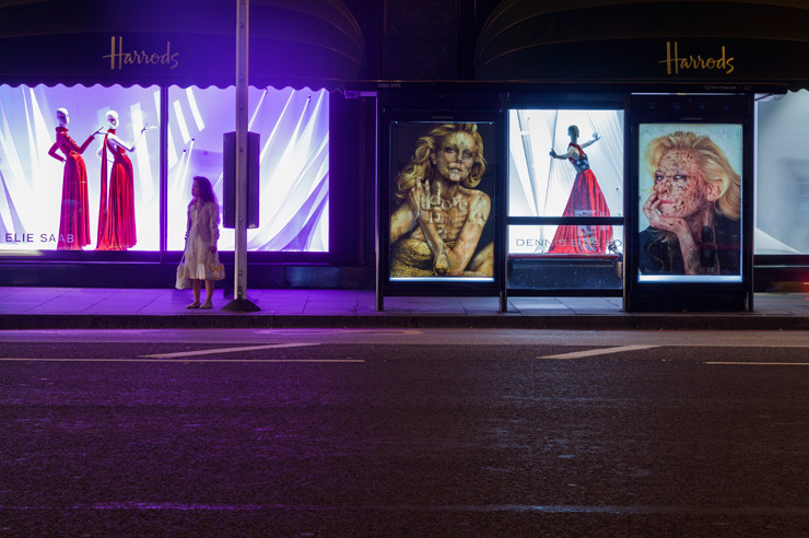 I was fortunate enough to meet Vermibus in London, and watched him install these two pieces in the bus shelter outside Harrods department store – in broad daylight, with hundreds of people walking back and forth along the street, in a clear demonstration of the ways in which ‘street art’ can still be deeply politicized.