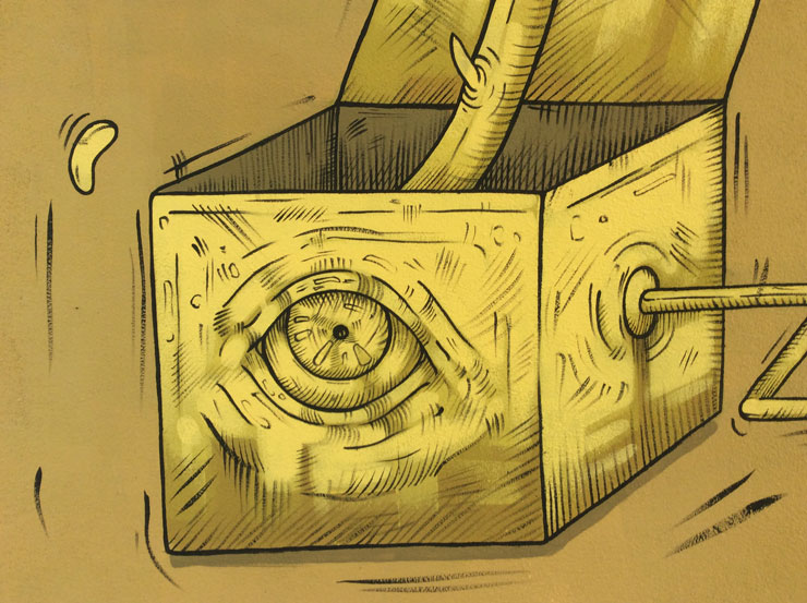 For his newest bad dream in Bosnia, the Italian Street Artist is equally surreal, set afloat from a jack-in-the-box, corkscrewed by a thorny rose, but still free to imagine – little dreams issuing forth from his reverie. Looking closely you see he is holding a key to his chest, perhaps this is the one that will free him.