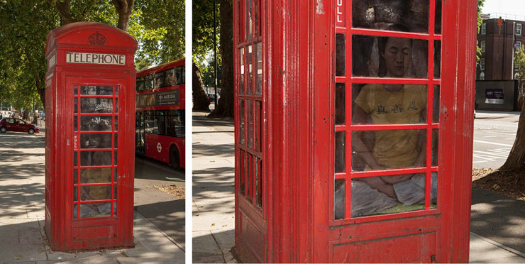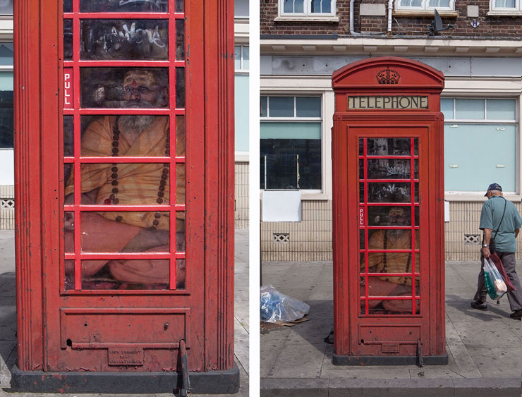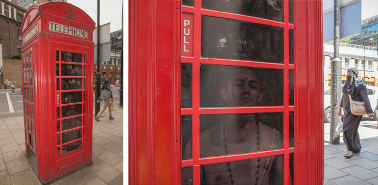 As it turns out, these quietly meditating illusionistic figures were measured and created for a size of booth that has fallen into disuse – a fact that he may have liked to know before painted these in his Brooklyn studio. There are two sizes of phone booths in London, Dan tells us; the K2 and the K6.