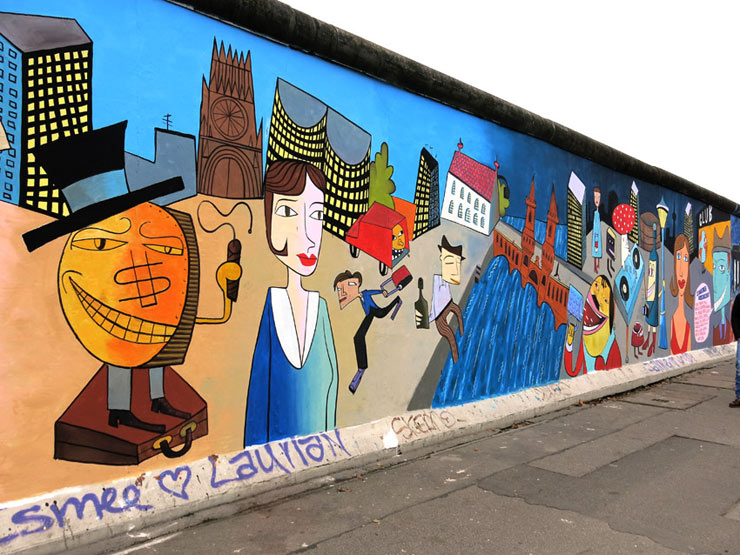 A constantly accelerating world is hard to document in a static mural, but Berlin’s Jim Avignon has been racing around the world to do it for quite a while. His bending neo-pop-comic illustration style cleverly points to his concerns about social, political and behavioral ills, as well as the communication and the technological race that appears to be outstripping our ability to adjust to it.