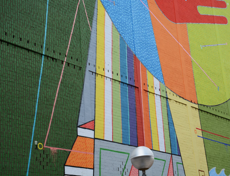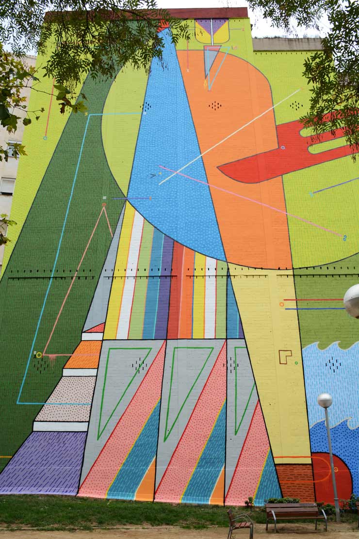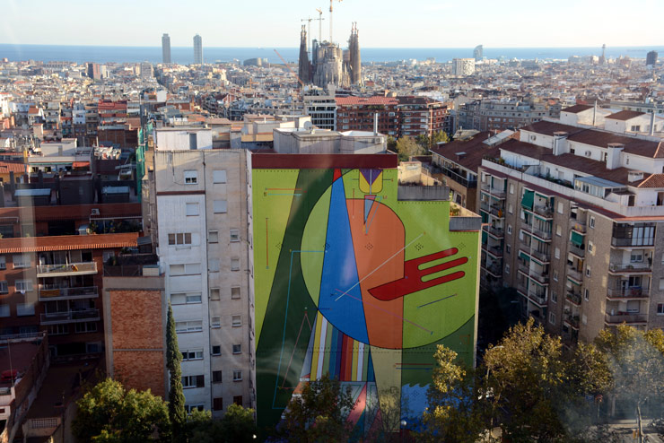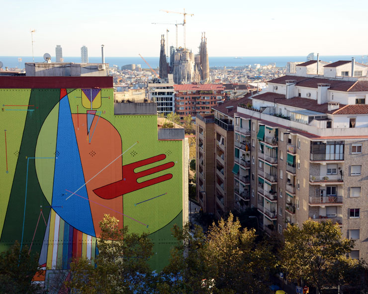 The Future-Folk Geometrist named Sixe Paredes is in Madrid at Palacio Neptuno this weekend for the Urvanity commercial art fair but today we have a look at a recent large scale pared he painted for the Open Walls Conference in Barcelona recently.