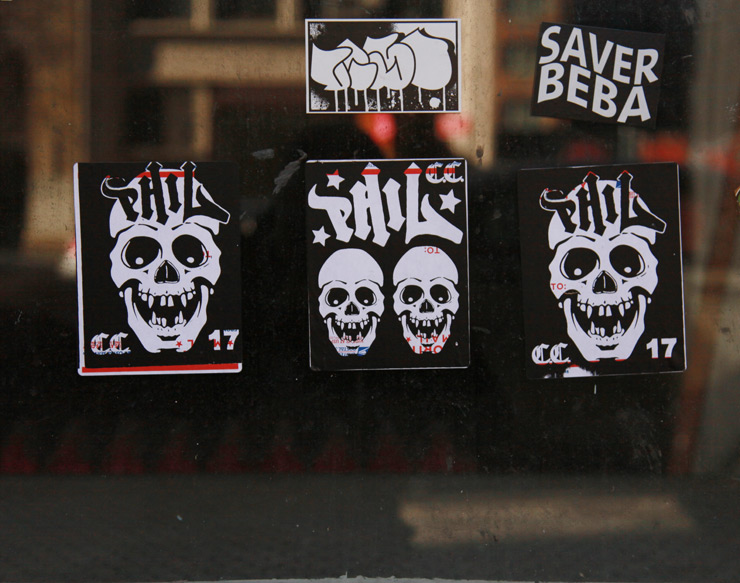 Begun exclusively perhaps as vehicles for handwritten or hand drawn missives, usually the tag of an artist, today they are often mass produced and designed on a screen, commercially printed on stock that is weatherproof, yet crumbles into pieces when you try to remove it. Personal and political are often on display, as well as that eternal graffiti impulse to simply spread your name.