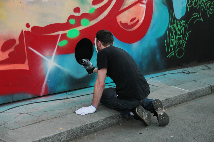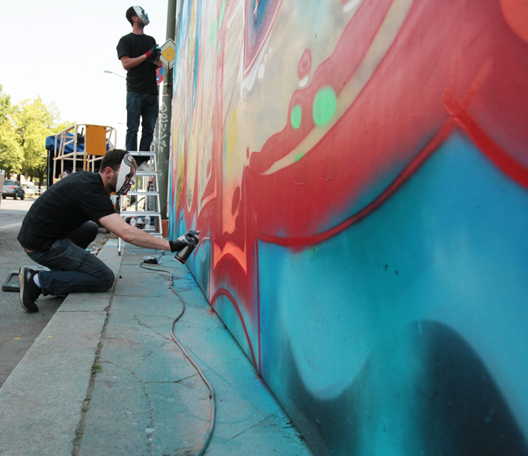 Shepard and his crew have just finished a large building side mural a block from here, as well as an expansive piece inside the museum space, where he’s DJing tonight. He seems to like the 1UP work and he also mentions how he digs Berlin Kidz and their style of rappelling down walls – and then talk turns to Brazillian pichação writers.