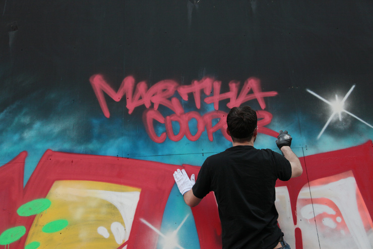 When a red-faced teenaged girl approaches one of the masked markers, he takes a minute to answer her inquiries, can in hand, ready to hit the wall but happy to respond to her multiple follow-up questions. Then he darts back up the ladder to spray a few small white starbursts while she aims her smartphone up at the action and he starts to looks for a red can to spray Martha’s name. Seeing Martha’s name up there seems appropriate, considering the first Martha Cooper Library will open here in four months.