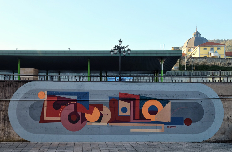 “Spogo is one of the most reknowned abstract street artists in Spain,” says photographer Fernando Alcalá of the Barcelona based geometrist who has installed a balanced composition that anchored at the base of an elevated freeway here in Oviedo, Asturias in the North of Spain.