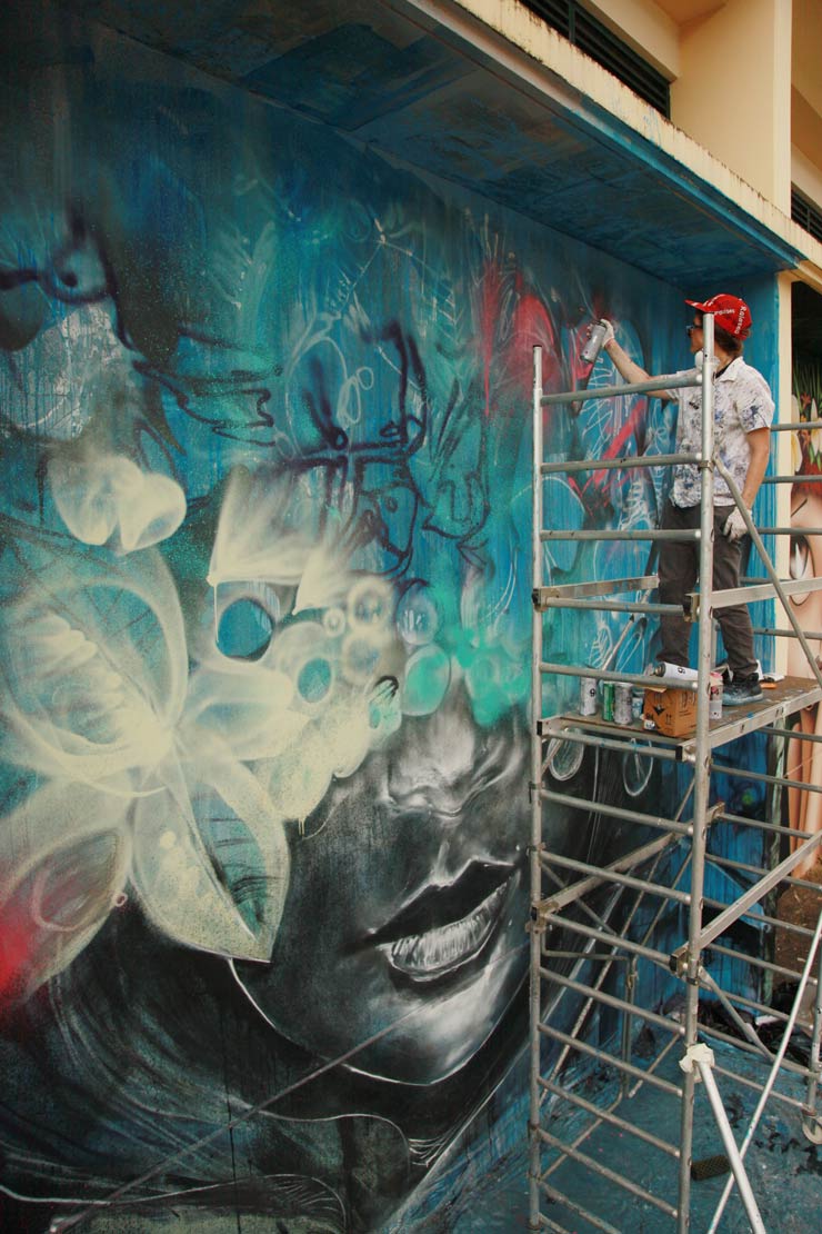 Each of the artists created new walls while our traveling troupe was stationed here so before moving on to Bora Bora action here are some finished walls in Raiatea. We’ll report on the happenings of that beautiful island soon (when we are not cavorting in the ocean) but in the meantime we leave you here with the Raiatea Walls.