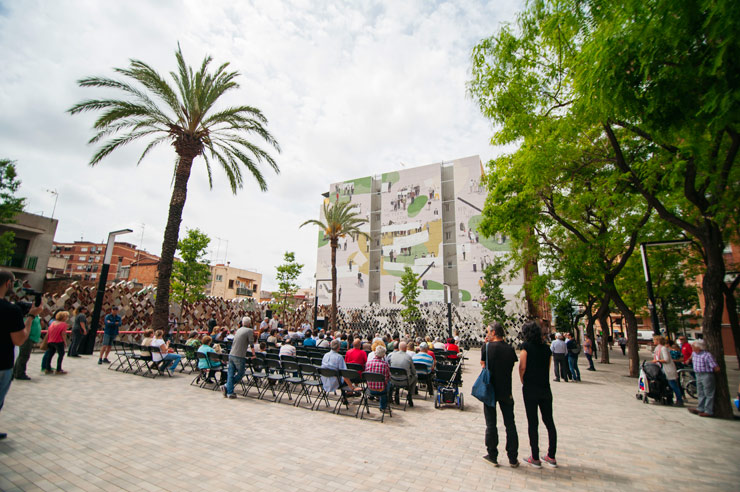 Winner of a competition among 300 international and national Street Artists last summer/fall on which BSA was part of the jury, the Spanish Street Artist has now completed his new mural in Sant Feliu de Llobregat entitled “La pared es nuestra” (The Wall is Ours). The wall borders the central square of outdoor civic life in a community of working people who coalesced and actively fought government neglect and resisted private capital brutality in the 1970s to create streets, services, and public space for themselves here.