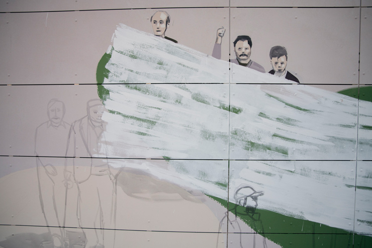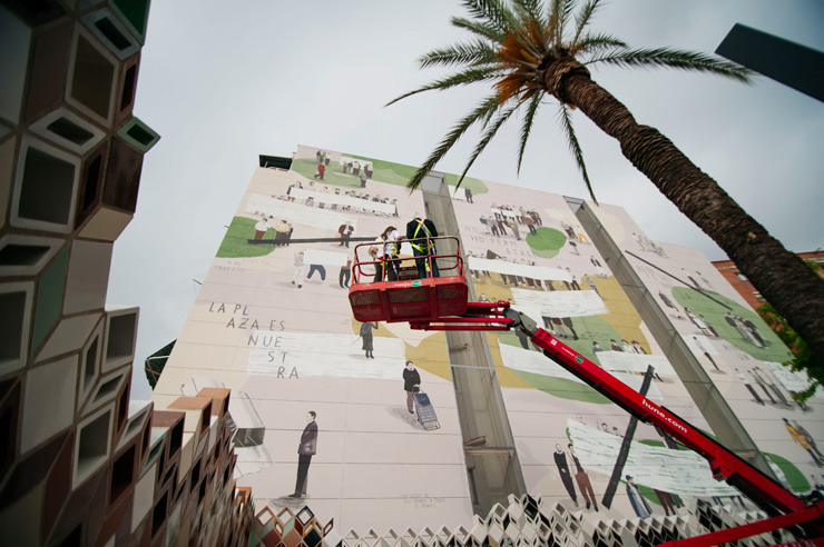 Known for his study and critiques of social, political and environmental undercurrents that form the framework of modern society, Escif worked with local leaders and the projects’ sponsors Contorno Urbano and Kaligrafics to conceive of and produce the result. The wall features a non-linear representation of historical events and popular/civic engagement that were necessary to transform the neighborhood. Referencing photos from the elders from the earliest days of struggle, the warmly flat characters and graphic elements are open and frank, focused the the central elements of democratic processes and the chaotic forms that can ultimately yield the right to self determination .