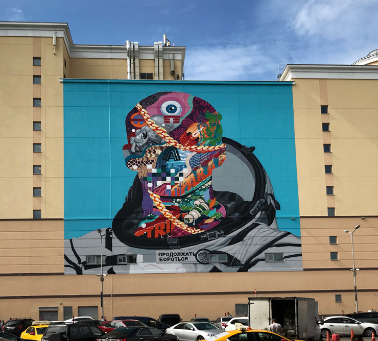 Ask most Street Artists looking for fame and they’ll tell you it is a bonifide space race out there – looking for the right wall that gets the best exposure to peers and fans is key to winning. Tristan Eaton is launching his murals around the world this summer – including New York’s famed Houston/Bowery wall and this cosmonaut themed installation that has landed in a heavily trafficked section of Moscow’s inner ring.