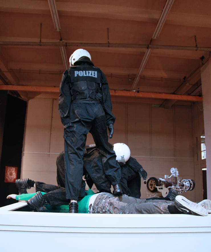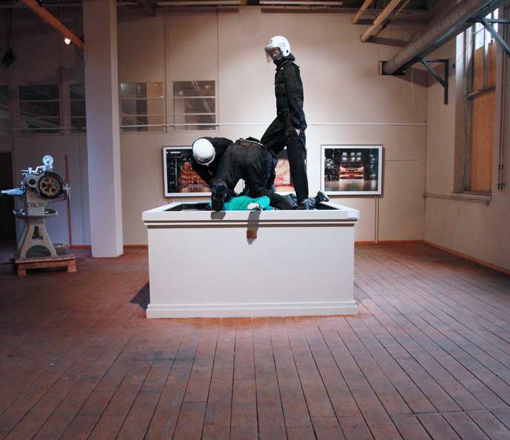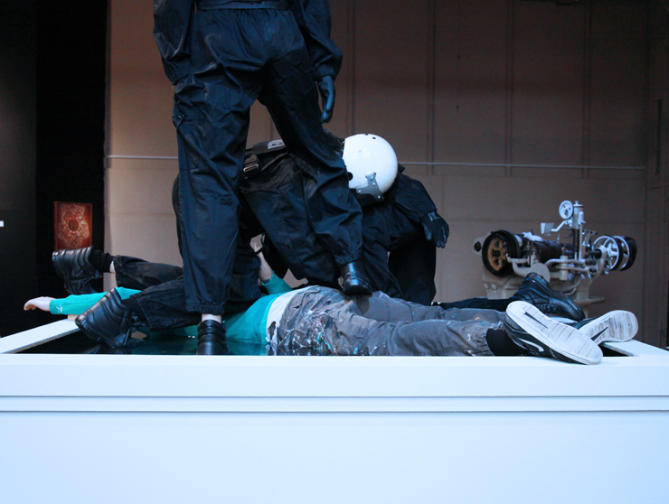 The uniformed Polizei here are actually made of mannequins but look particularly life-like probably because Schnu broke the figure in multiple locations to reposition the limbs in more natural angles. Hearing that he “broke” the figure sends chills, as you can imagine being one of the people thrown to the ground by these armed people, your limbs pressed upon and even broken.