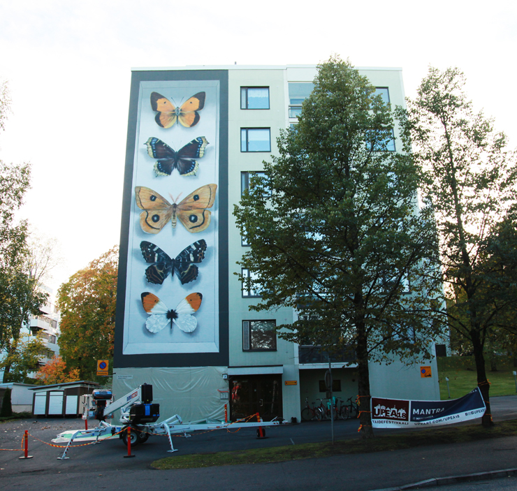 On a cold and damp September day here in Hyvinkää, about 50 kilometers north of Helsinki, for the UPEART 2018 mural festival, we find Mantra high atop a cherry picker finishing the antennae of a butterfly and the shadow of a moth’s wing. He uses aerosol cans, rollers, and brushes to accurately represent a winged fivesome on the side of a residential apartment building.