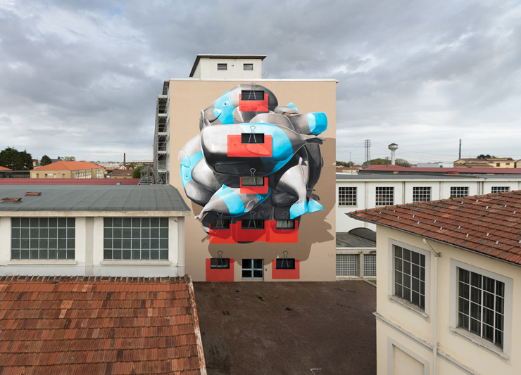 A certain defined maritime surrealism again provides us the lens through which NEVERCREW interprets the dominance and selfish behaviors of man over nature and how they continue to backfire. A “Cluster” of sea animals and binder clips and folders float on over and below one another in this new mural in Novara, Italy.