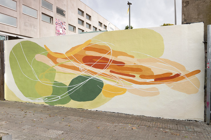 A recent act of extreme weather in Italy inspired this new mural in Sant Feliu de Llobregat by Lucia Pintos (aka Nulo) from Montevideo, Uruguay. A huge storm had devastated an entire forest, destroying thousands of trees, scattered like toothpicks across the mountains and land.