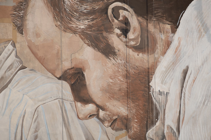 No worries, we’re bringing in the ‘The Carpet Repairmen’, a new large scale mural collaboration between Australian Street Artists Guido Van Helten and Fintan Magee that they finished as a commission recently in Tehran, Iran. Meant to mark the 50th anniversary of the Australian Embassy in Iran, the current US president naturally ruined the timing of the celebration of peace and goodwill by putting more sanctions on the country and tension on the event, say the artists.