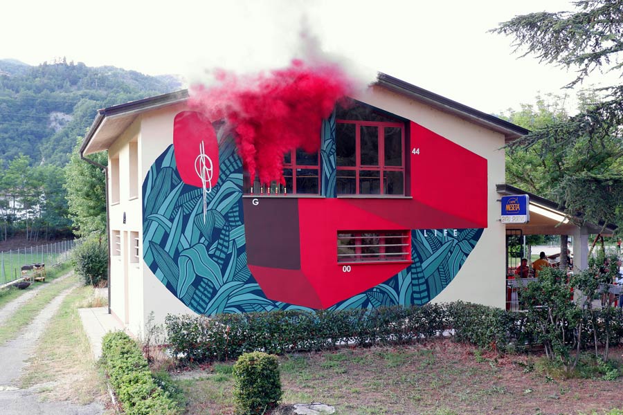 “Do it with passion or not at all!,” says Giulio Vesprini on this acid red cloud of paint that engulfs a portion of his new mural. The fog effect has become popular in public performance of late, adding a mystery of murk to photoshoots and videos, but not so many Street Artists have found a uniquely intrinsic way to make it work with their painting.