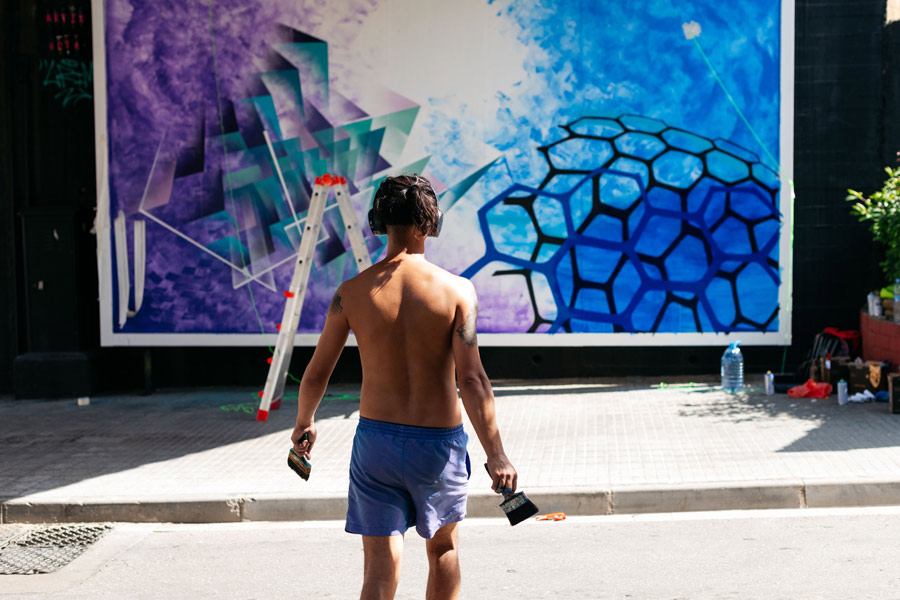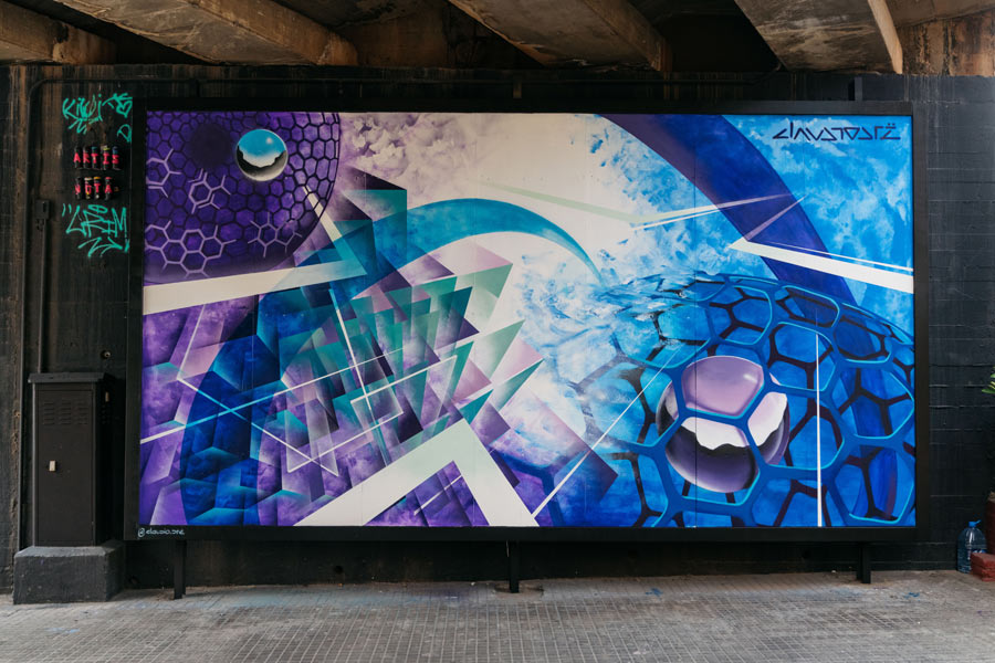 Chilean born, Barcelona-based former graffiti writer Dr. Drë began on the streets in 1996 with aerosol and eventually experimented with oil, acrylic, and canvas. His murals and fine art have been exhibited in Chile, Latin American and Europe. He has an affinity for the technical, the fine line, volume, and perspective. His new mural draws upon his original fascination for graffiti, geometry, psychedelia and the letterform, bringing each to a more futuristic dimension.