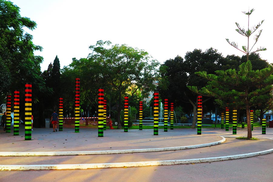 Street Artist converts mundane sculptures into giant audio equalizer bars at edge of a greenspace.