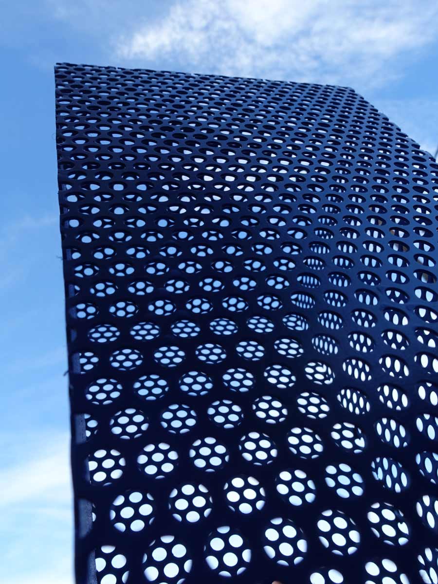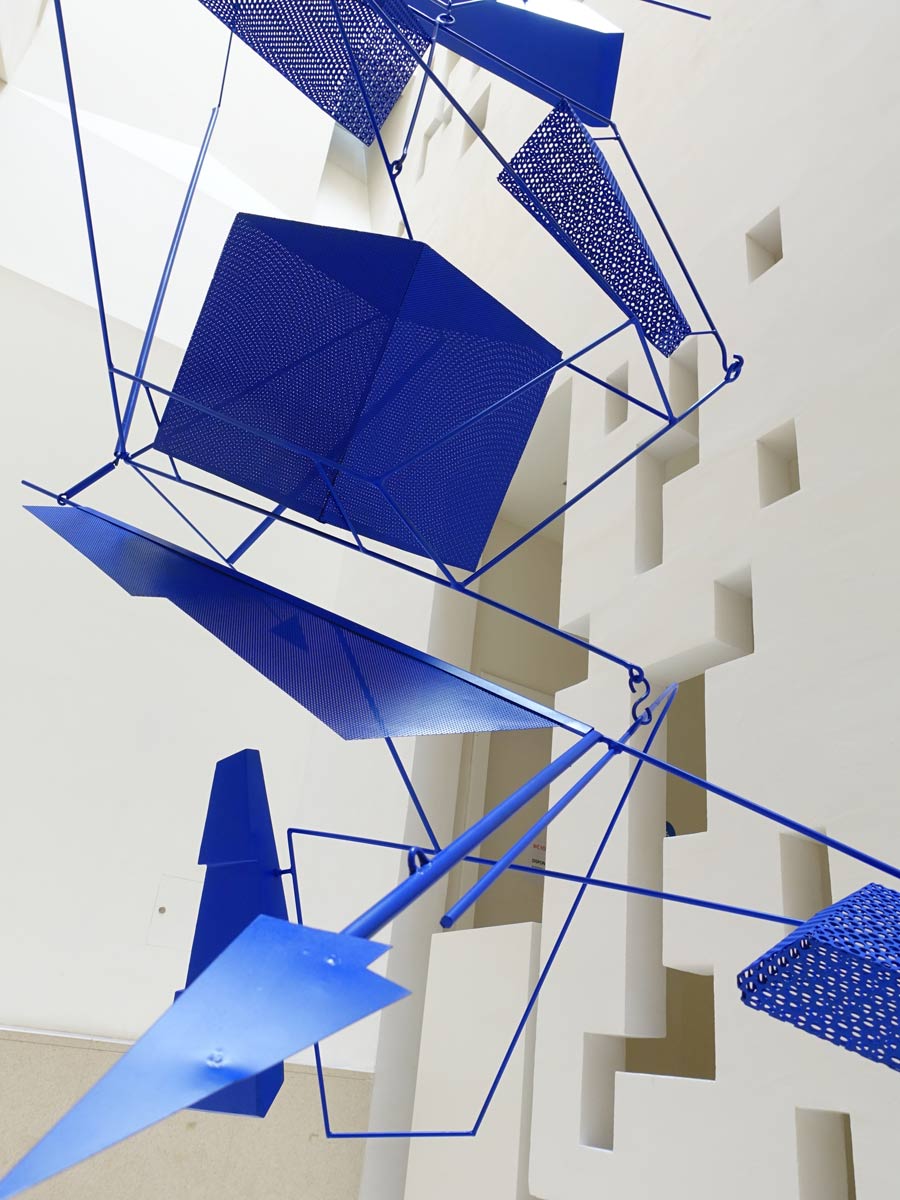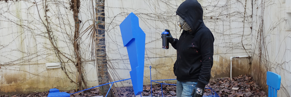 Unveiled during an opening a week ago, a dynamic new blue resistance is on display in this inaugural space at the University of Badalona (Catalonia). A serrated kinetic mobile turning slowly as artist Elbi Elem brings her spray can inside for finishing aerosol touches the cerulean abstract.