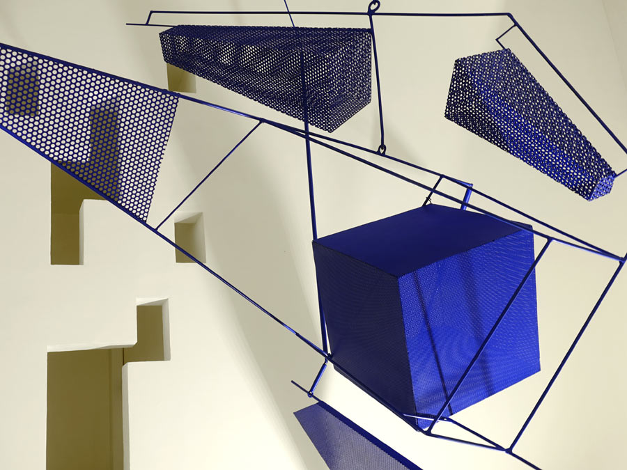 The muralist had been creating dimension on walls with paint and geometric assemblage for years, eventually popping out from the wall in 3-d sculpture. Now she is creating with metal, wood, and PVC – and hanging free, gently gyrating and re-casting shadows in public space in new ways that electrify her mind and imagination.