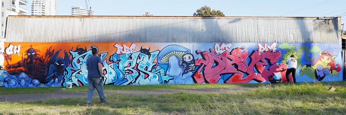 “Ralph Bakshi’s representation of good and evil wizards is the setting chosen by Australians Phibs and Dave to contrast their clash of styles. In this spectacular video, Colin McKinnon captures the process of this wall production carried out in Sydney.”