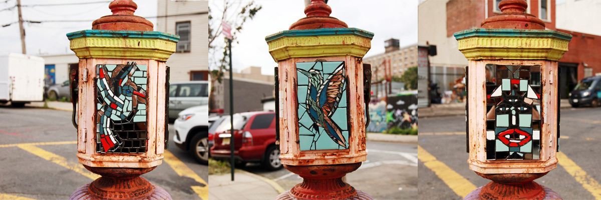 Once tied directly into an emergency network that would bring firetrucks within minutes, many are now ornate buoys bobbing in the concrete ocean, anchored to a world that lies underneath all of this. With ceramic and glass tiles applied illegally to these century-old sculptures with firey flames atop, some artists seize the opportunity for an artfully framed display to capture your attention – embellishing this street furniture with a certain flair in multiple locations of a neighborhood.