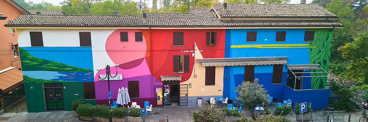 “I reinterpreted this facade with elements of color and graphic structures that have clear references to the life of the Social Center and that emerged during the meetings held with residents of the area,” says Vesprini of the inspiration for this new abstract exterior wall in Reggio Emilia, Italy. By asking questions and listening to the stories people told him in the Gattaglio District, he says he understood the way of life here and incorporated symbols, colors, and history into his composition.