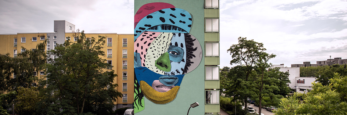 What makes this project in the Berlin-Spandau district truly captivating is its engagement with local kids at a youth center through an inspiring art workshop. During this workshop, the artists introduced their mural concept and collaborated with the young participants to create captivating collages and individual portrait photos. The mural is an eclectic collage sketch that beautifully incorporates elements from the participants’ faces, effectively symbolizing a collective identity for the neighborhood.