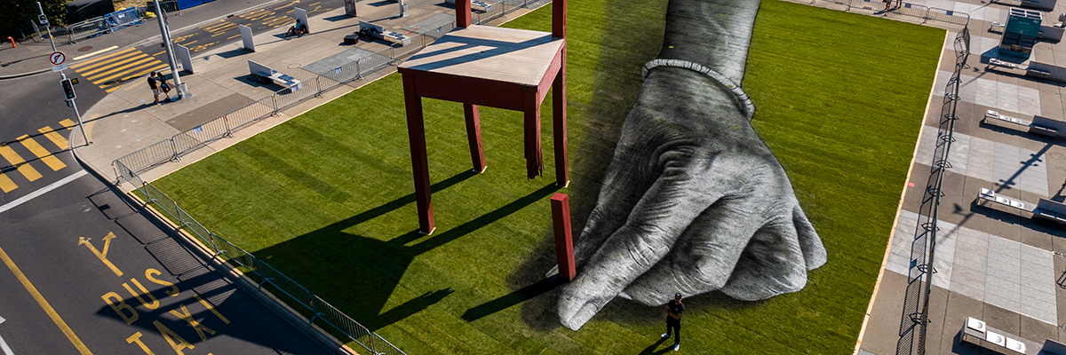 Now in his mid-thirties and painting large skill land art for over a decade, it is still a pleasant surprise to see renowned street artist Saype unveiling a new masterpiece. His recent project in Place des Nations, Geneva, was commissioned by Handicap International. With it, he hopes to present an eco-responsible image that depicts a hand emblematic of humanity, offering a new leg to the iconic “Broken Chair” – a symbol for the numerous innocent victims of war bombings.