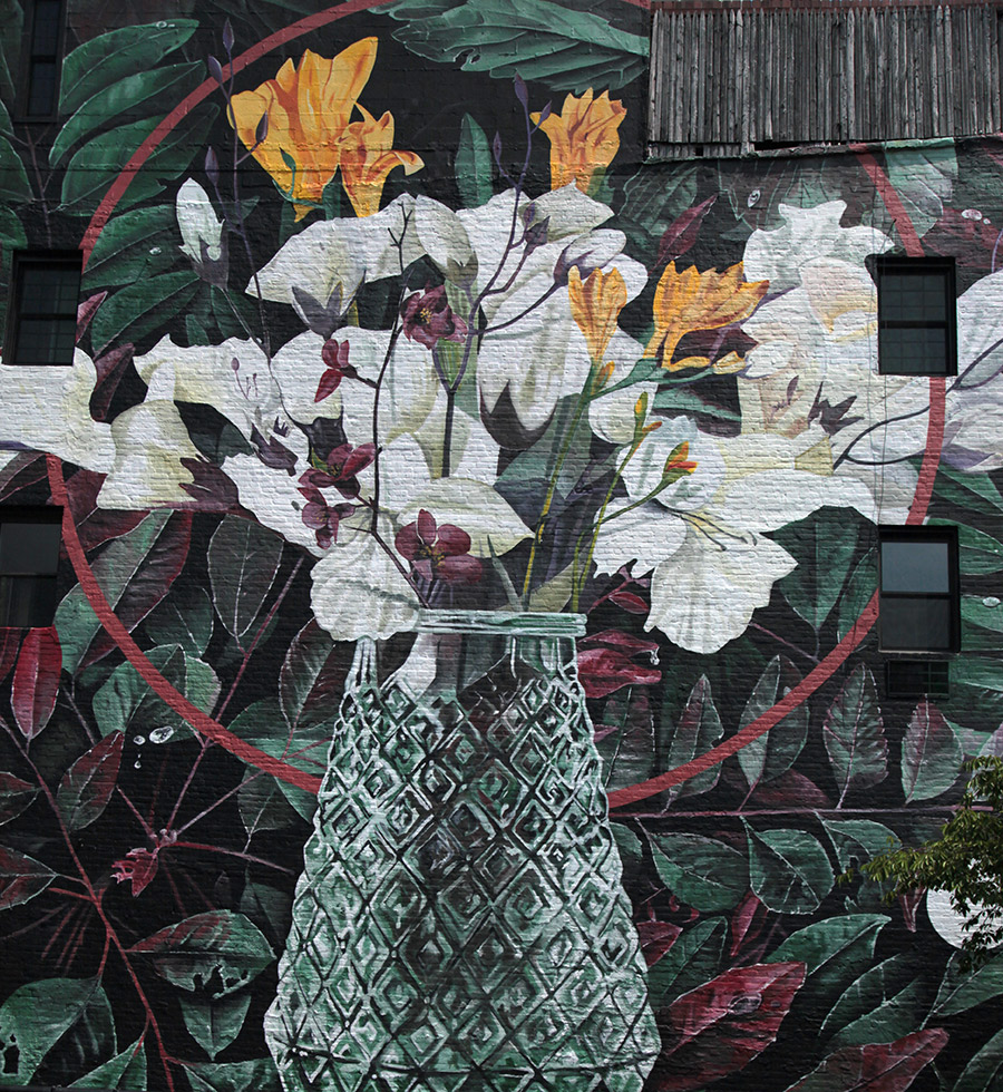 Known for his thoughtful combinations of botanical illustration and scientific symbology, Fabio Petani has painted his signature visual language on public walls from Europe to the Americas. Initially from Pescara, Italy, he approaches each mural as site-specific, researching the environment, history, and ecology of a place before selecting his subjects. His work often pairs the Latin name of a plant with a chemical compound that has metaphorical or environmental significance. Here in New York, Insulin & Spartium Junceum speak of resilience, adaptation, and inner rhythms—fitting themes for an NYC neighborhood shaped by constant movement and reinvention.