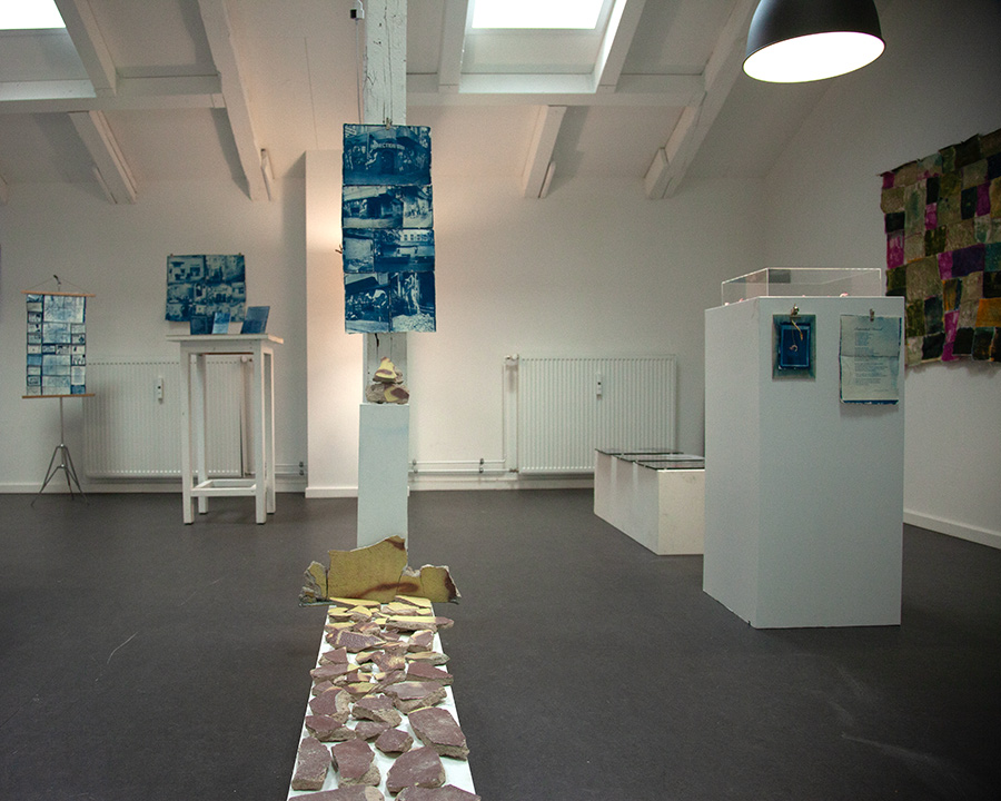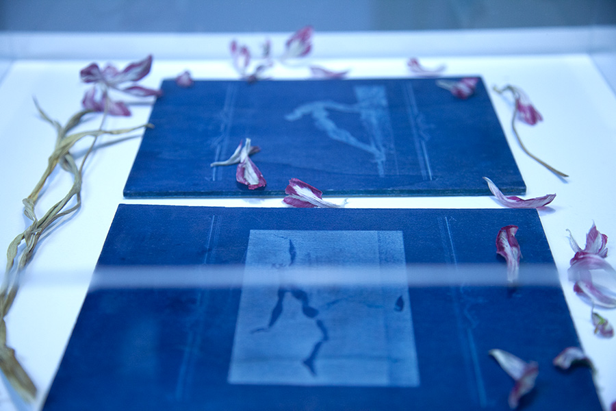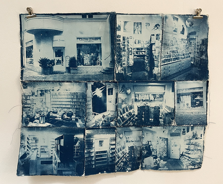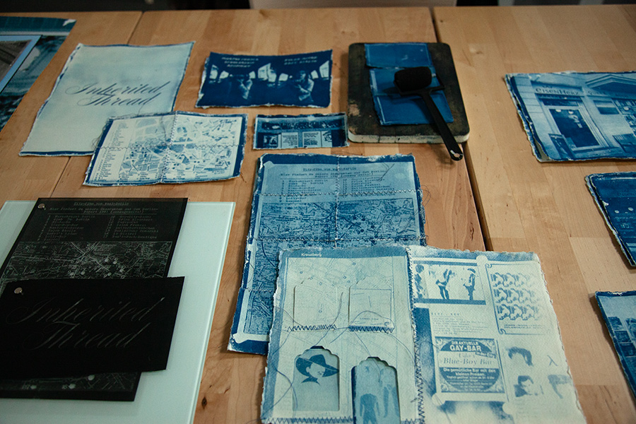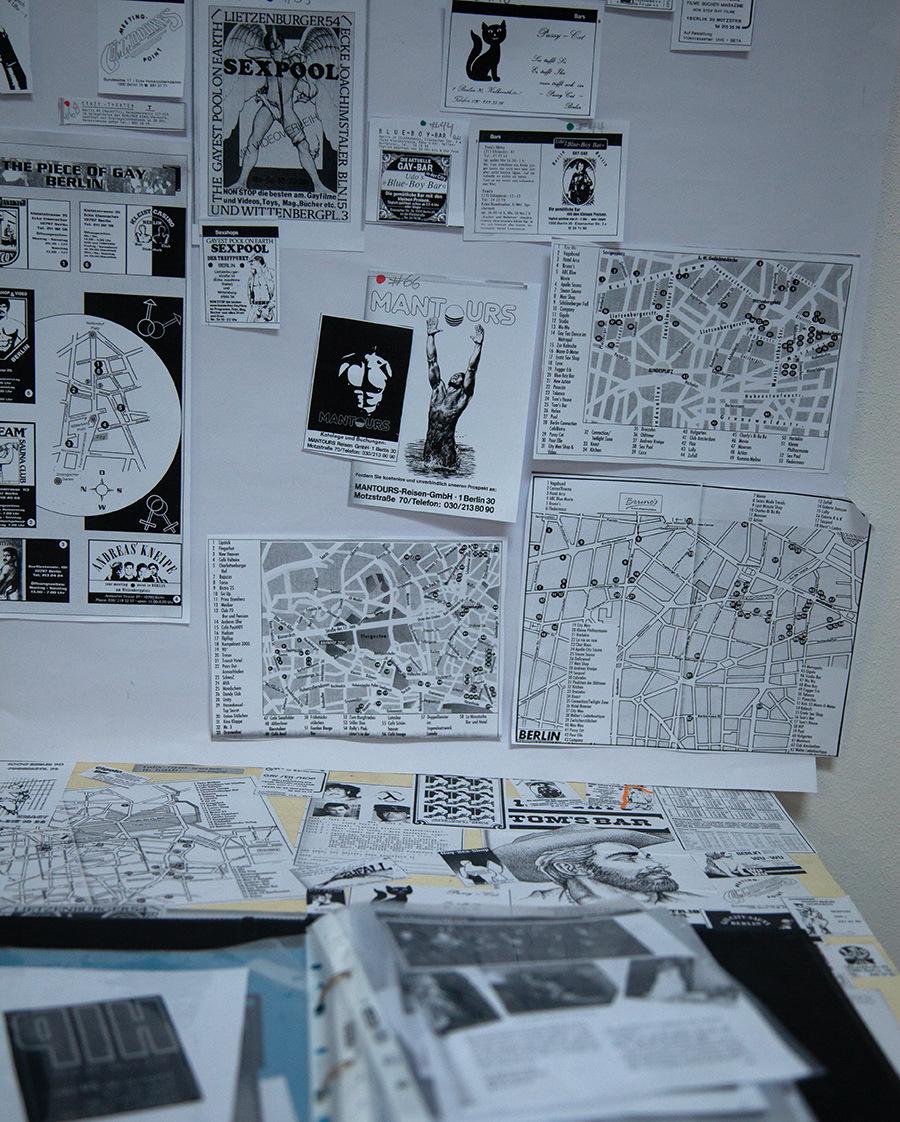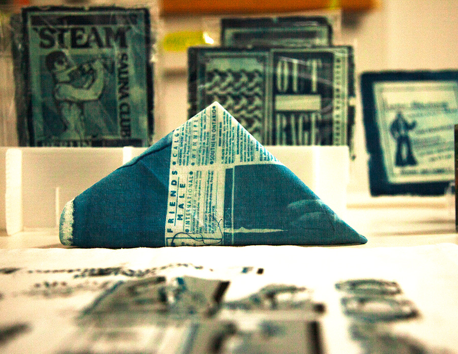 His research led him to retrace the locations of social clubs and bookstores and to pore over a varied and deep selection of printed and digitized materials at the LGBTQIA+ archives at the Schwules Museum in Berlin, including the publication Berlin von Hinten. Thanks to the careful collecting and preservation by many in the Berlin community, the artist says he found himself faced with an overwhelming array of diverse materials to study. Mitro brought his own scanner into the reading room, mechanically capturing pages to “deal with later,” making sure nothing important slipped past him in the flood. When he began making cyanotypes from sex journals, classifieds, and Berlin bar magazines like Berlin von Hinten, he was not merely appropriating images but changing their context and use, turning fragile, easily discarded ephemera into durable goods like book pages, prints, even shirts that he wore into the public and to the opening of his exhibition.