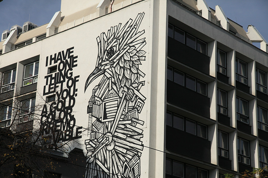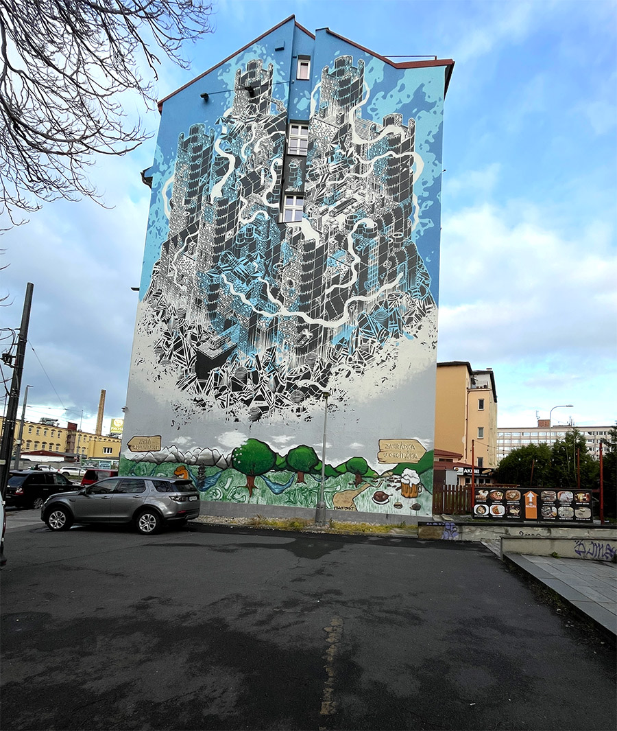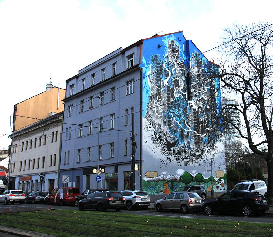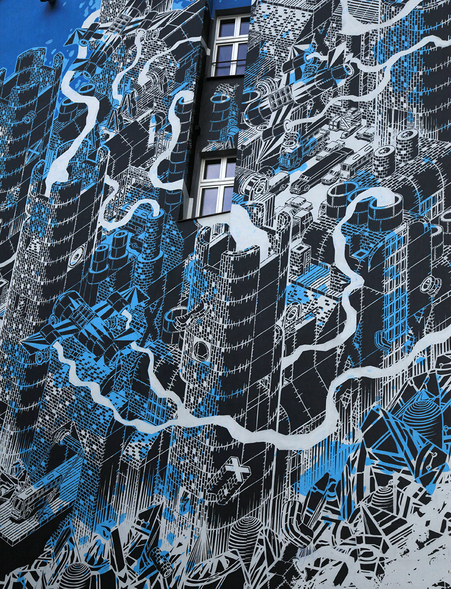 M-City (Poland) is recognized on many continents for his large-scale stenciled cityscapes with industrial themes. His mural in Invalidovna, “Road Ahead Closed,” presents a dense monochrome metropolis made from layered mechanical motifs and factory forms.