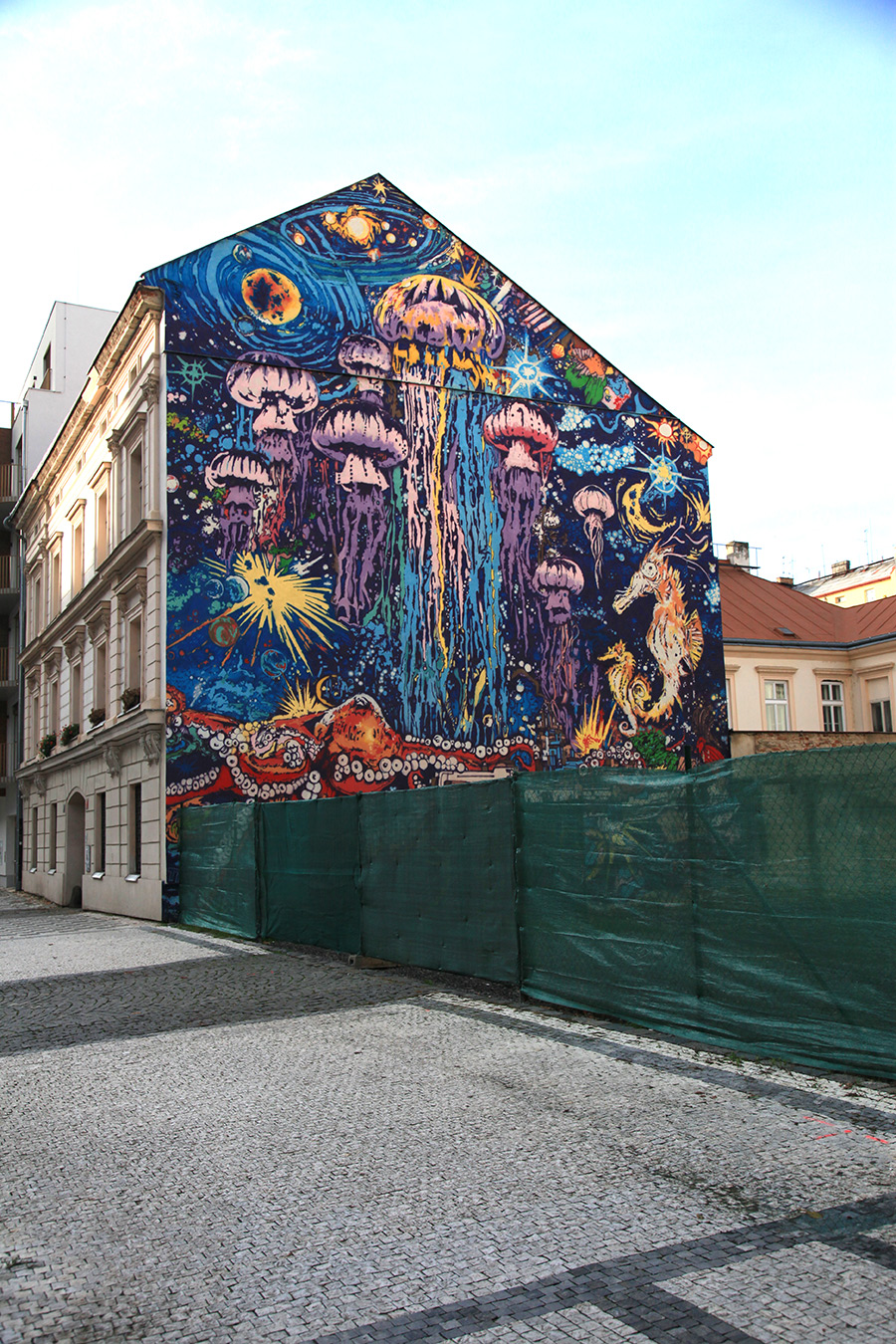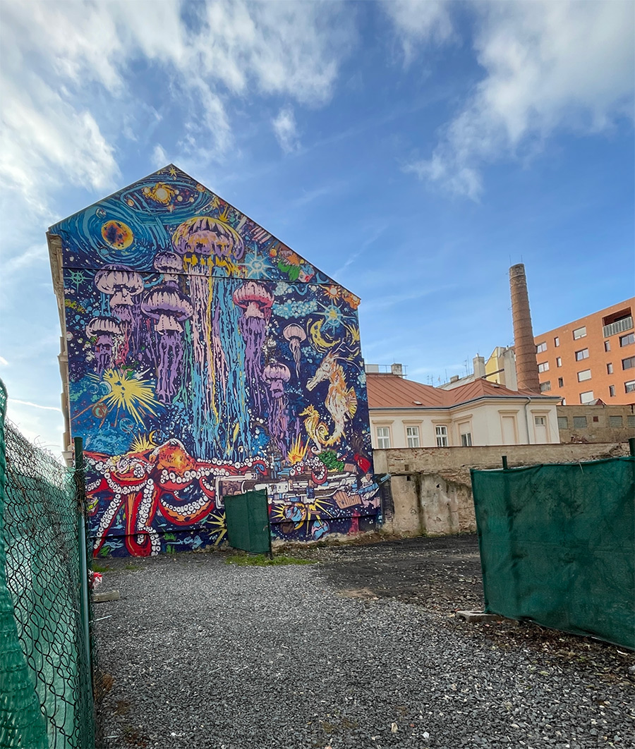 Michal Škapa (Czech Republic) brings a graffiti-rooted, semi-abstract style to murals, often with cosmic or social themes. His Vesmír medúz (“Universe of Jellyfish”) in Prague’s Karlín district for the 2022 edition of “Wall Street Prague”, the inaugural version of what would later become Urban Pictus. Škapa painted a vertical mural that depicts glowing, jellyfish-like forms ascending like spacecraft against a dark background. The piece reflects his signature fusion of street art energy and speculative futurism, creating a surreal visual field that floats somewhere between deep sea and outer space.