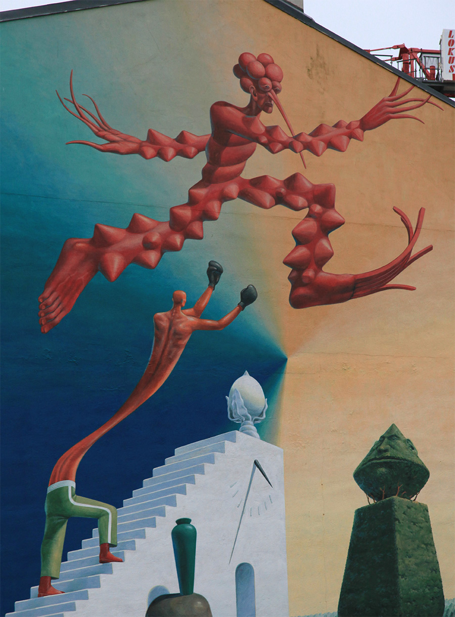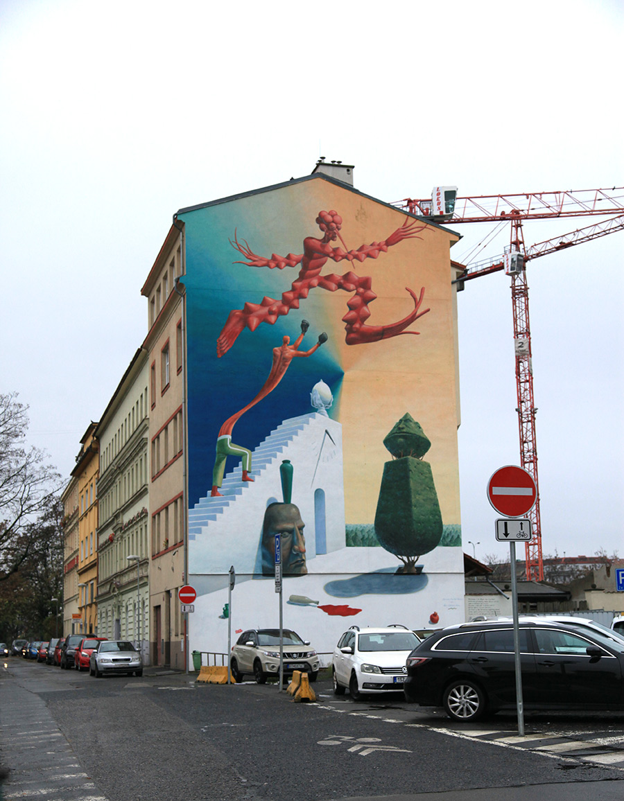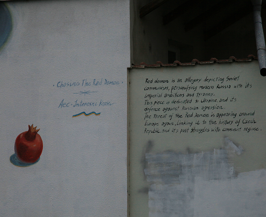 AEC / Interesni Kazki (Ukraine) is known for surreal, mythic, sometimes epic murals. His piece “Chasing the Red Demon” in Holešovice allegorizes resistance to Soviet imperialism, referencing both Ukrainian and Czech histories.
