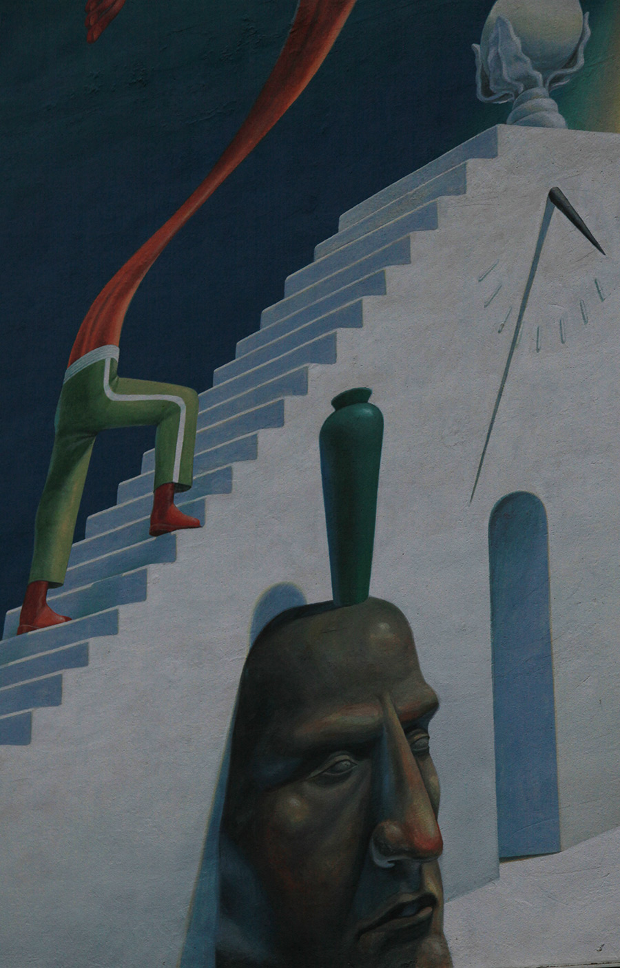 Dede Bandaid (Israel) uses warm-toned urban illustration with metaphorical motifs. His mural “Ambitions” in Žižkov, created with poet Nitzan Mintz, pairs wooden animals with a Czech-language poem about creative drive and personal sacrifice.