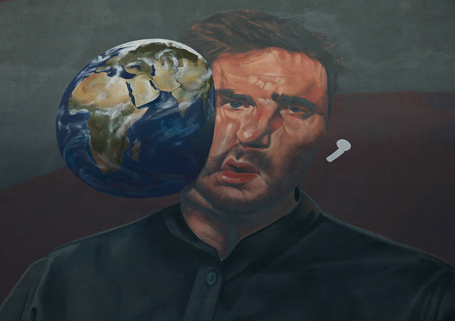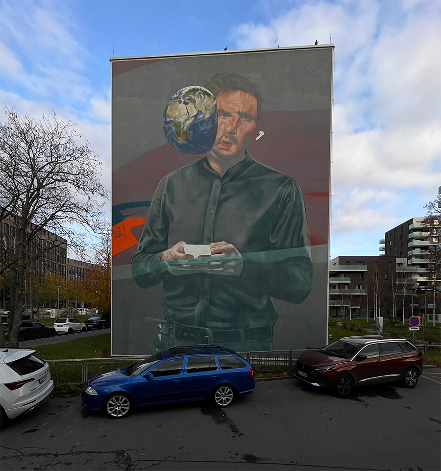 Innerfields (Germany), a trio known for blending realism and symbolism, painted a mural in Karlín of a figure staring at a smartphone while a levitating Earth floats nearby, striking him in the head—a reflection on digital distraction and environmental neglect.