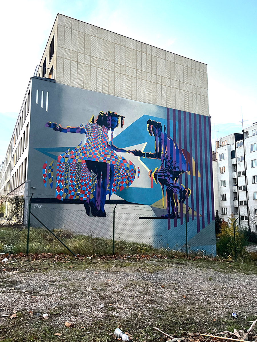 Lukáš Veselý / Malujeme Jinak (Czech Republic). The brothers use optical tricks and graphic design to bring kinetic energy to this university environment. Their Holešovice mural on a student residence features abstract dancing figures that celebrate youth and movement.
