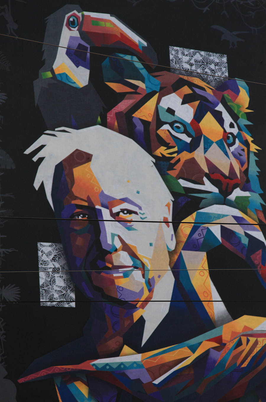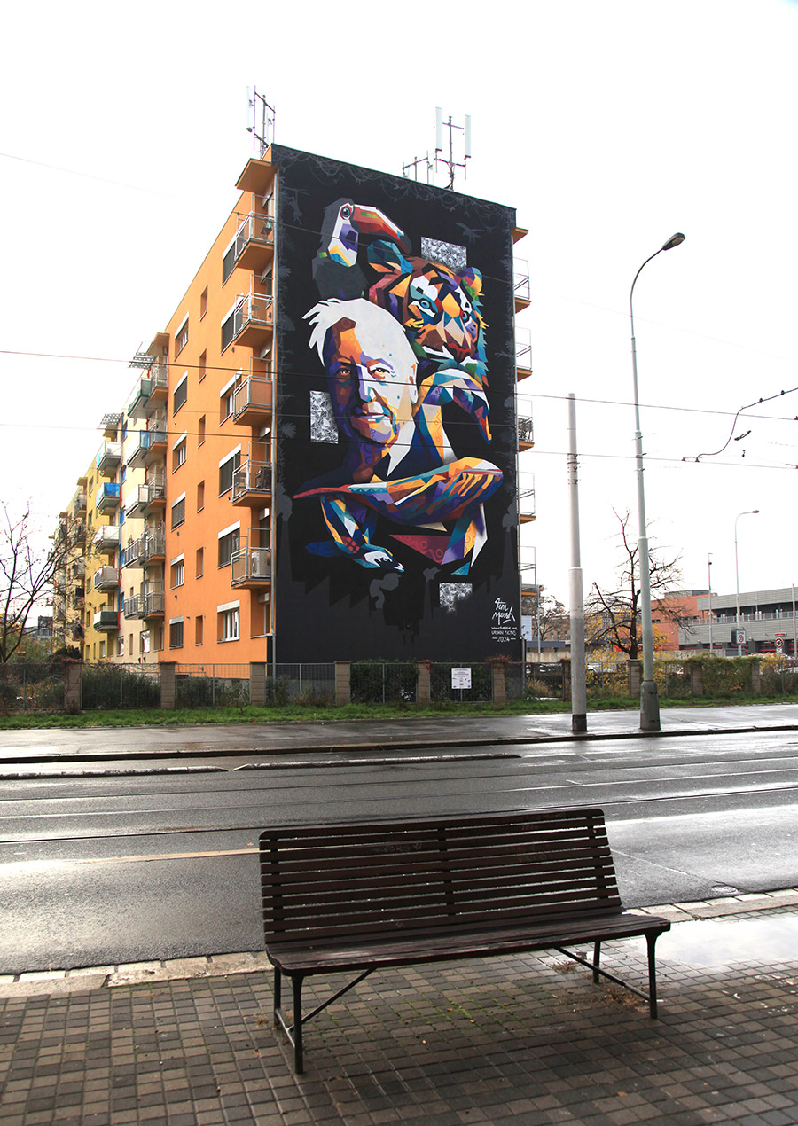 Tim Marsh (France/Spain) works in geometric abstraction, using bold colors and masking-tape precision. His 22-meter mural in Holešovice portrays David Attenborough surrounded by animals, part of his ongoing series celebrating biodiversity.
