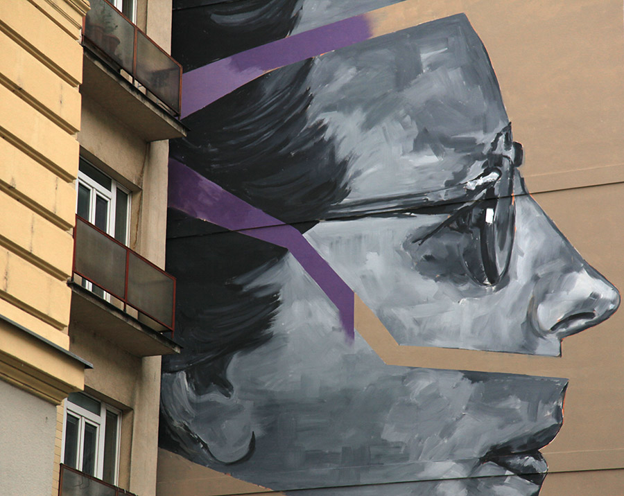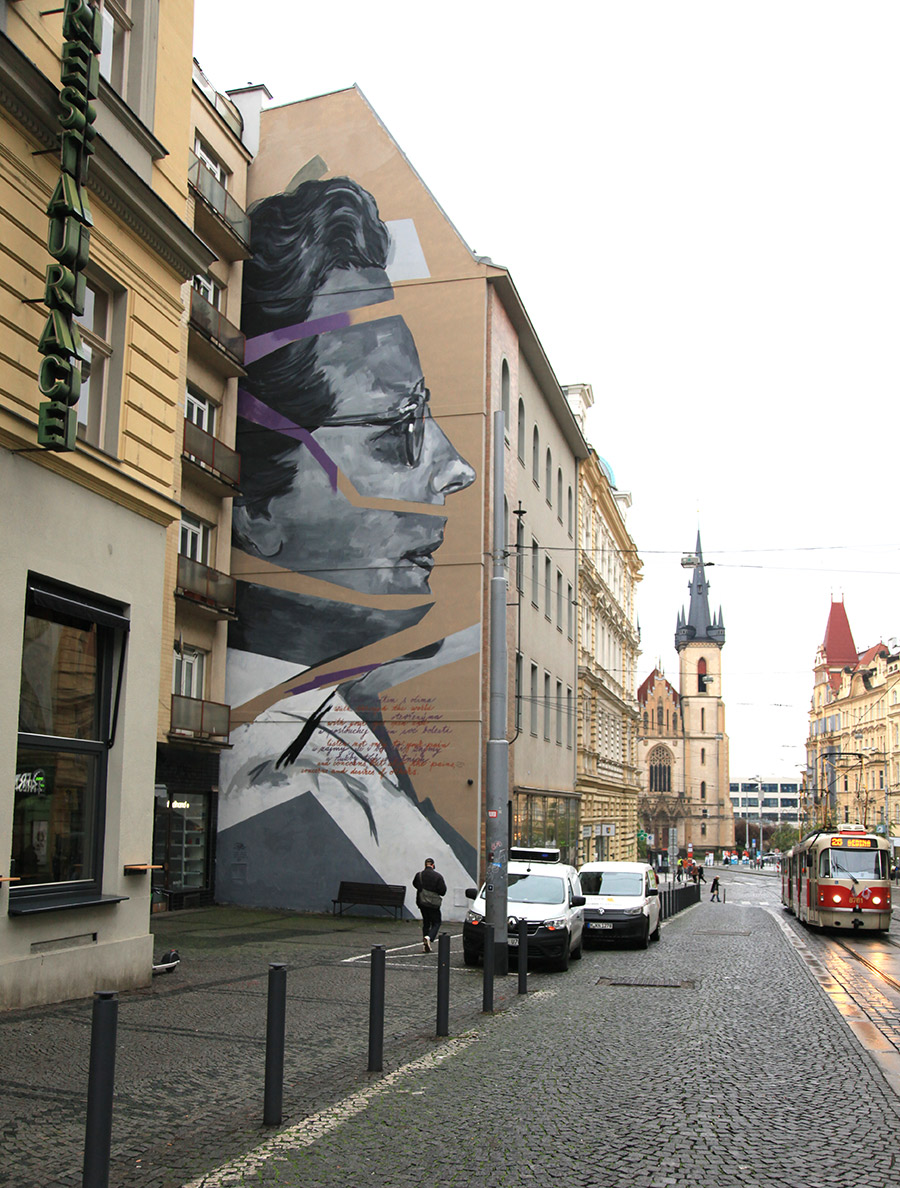 Toy_Box (Czech Republic) is known for blending classical painting, comic art, and street aesthetics. Her mural on Milady Horákové Street in Prague 7 honors the politician Milada Horáková on the 75th anniversary of her execution by the communist regime, depicting her portrait in fractured forms alongside a bilingual quote.