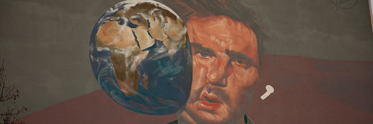 Innerfields (Germany), a trio known for blending realism and symbolism, painted a mural in Karlín of a figure staring at a smartphone while a levitating Earth floats nearby, striking him in the head—a reflection on digital distraction and environmental neglect.