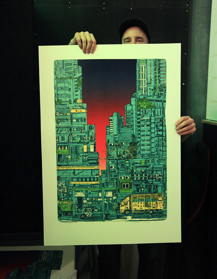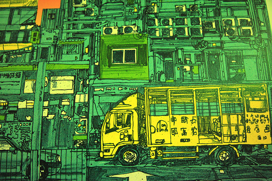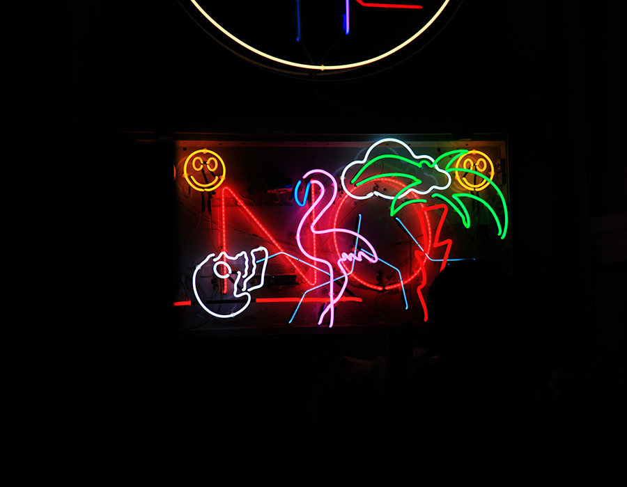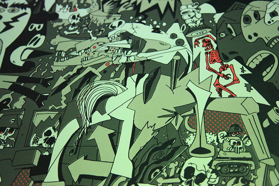With great appetite for discovery, Škapa moves fluidly between media — neon, lithography, silk-screen, drawing, comics, hand-painted canvases, sculptural models — driven not by stylistic restlessness but by a desire to test how each material can host or distort his visual language. His collaborations with Czech glass studios illustrate this curiosity. He showed us vases produced through layered techniques involving silk-screened transfers, hand-drawn enamel lines, and kiln-fused materials.
