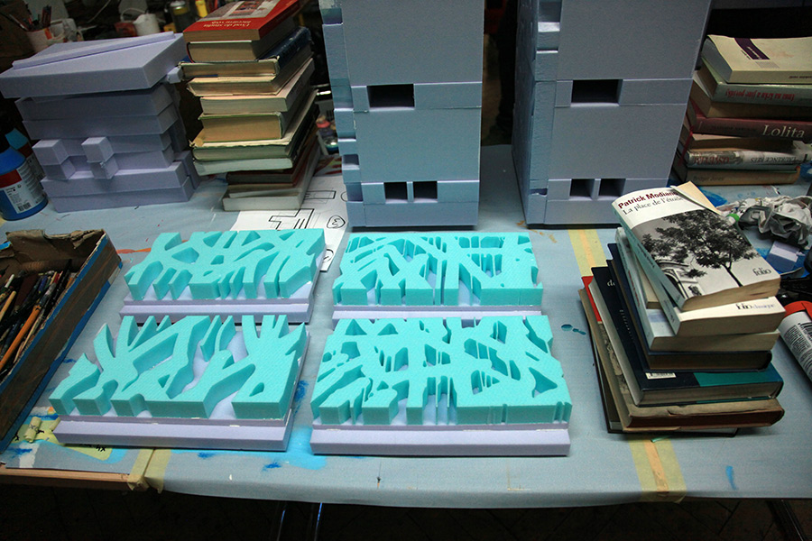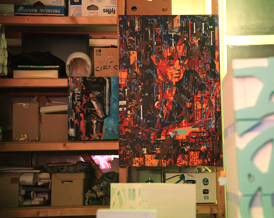 Škapa’s studio makes clear how central his self-created alphabet is to his practice — a system that merges graffiti logic with global typographic traditions. He describes it as “based on the Latin alphabet but mixed with inspirations from Brazil, heavy-metal logos, ruins, all kinds of writing systems,” his is a layered script that allows him to embed messages and structure his compositions. Some of his works contain readable words; others dissolve into semi-abstract fragments that behave like scaffolding or urban grids. Skapa is in love with the urban cityscape and its language pushes up like a raised grid into many of his works.