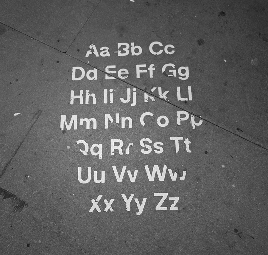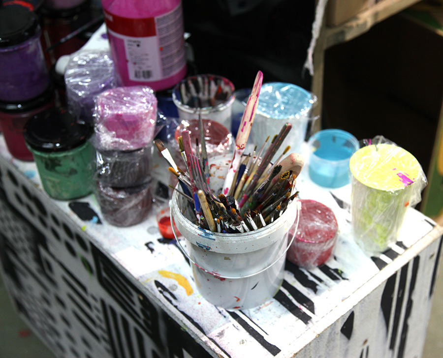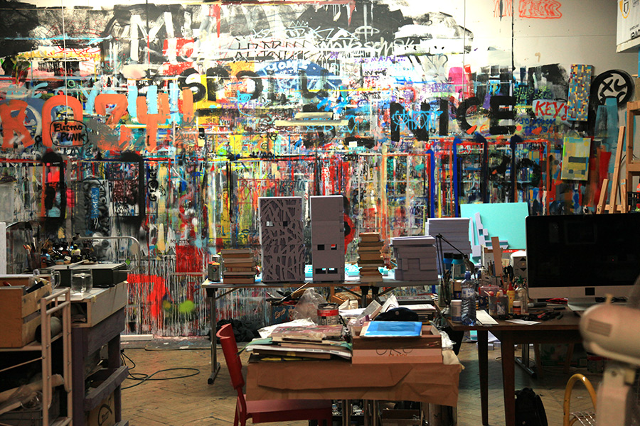 We had the opportunity to tour the artist’s studio, see many of his works in progress, to read the layering of the walls, and to learn from his wide-ranging experience and storytelling what themes drive him. Among them were these three: the construction of a personal alphabet, cross-media experimentation, and the transformation of graffiti experience into contemporary practice.
