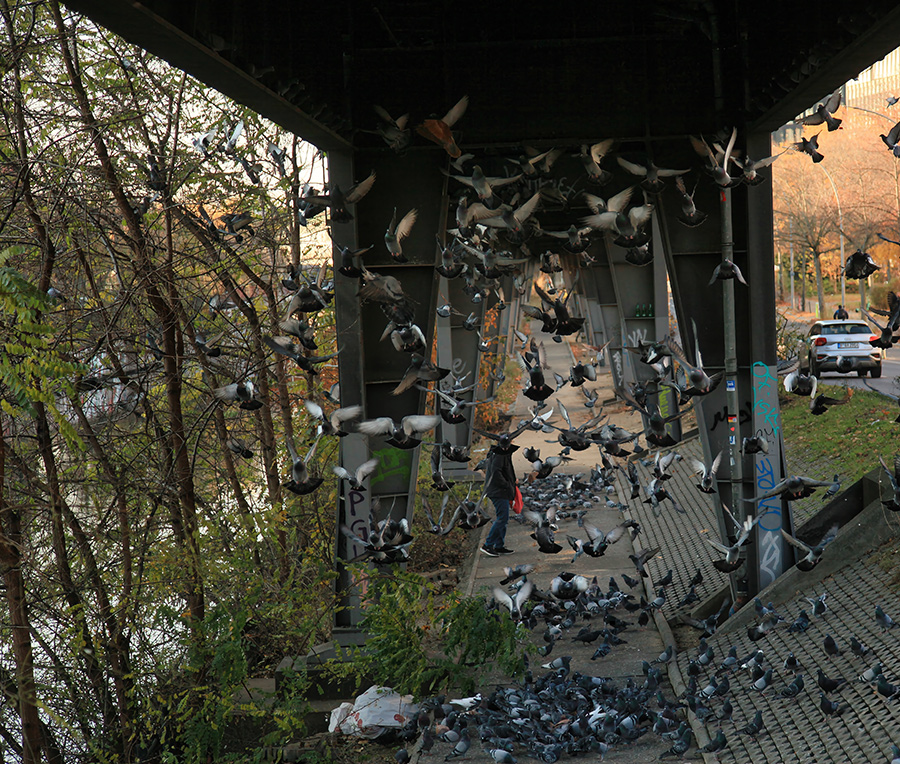 The kinetic chaos of this feathered flurry under a Berlin train track this fall is heightened by the memory of a threat from the woman feeding these pigeons, and her devotion to their needs. Not only did she refuse to let us pass by when she was feeding the wild winged wonders, but she also threatened to seize the camera! Don’t worry, sis, no faces!