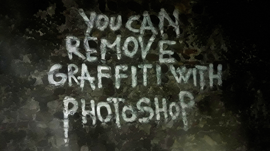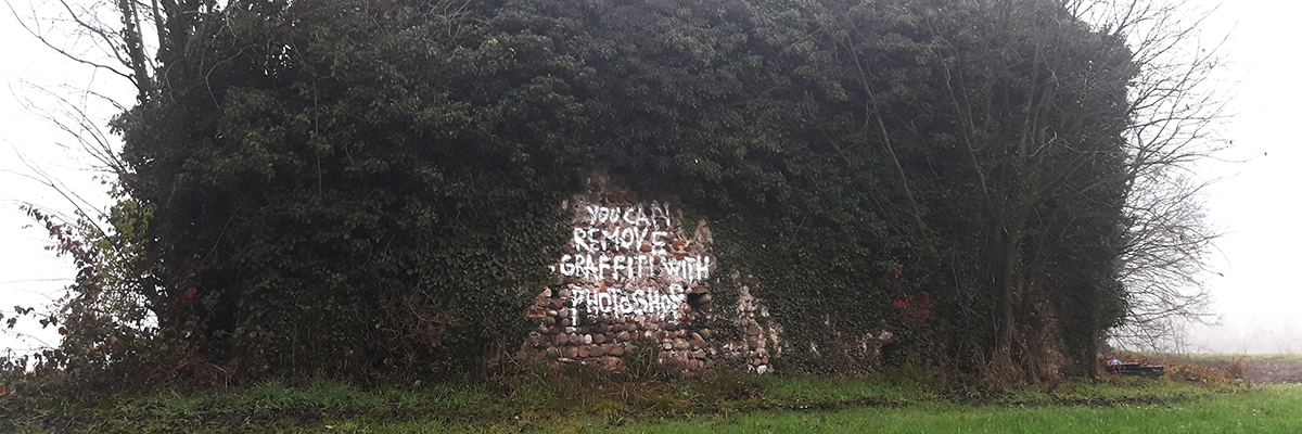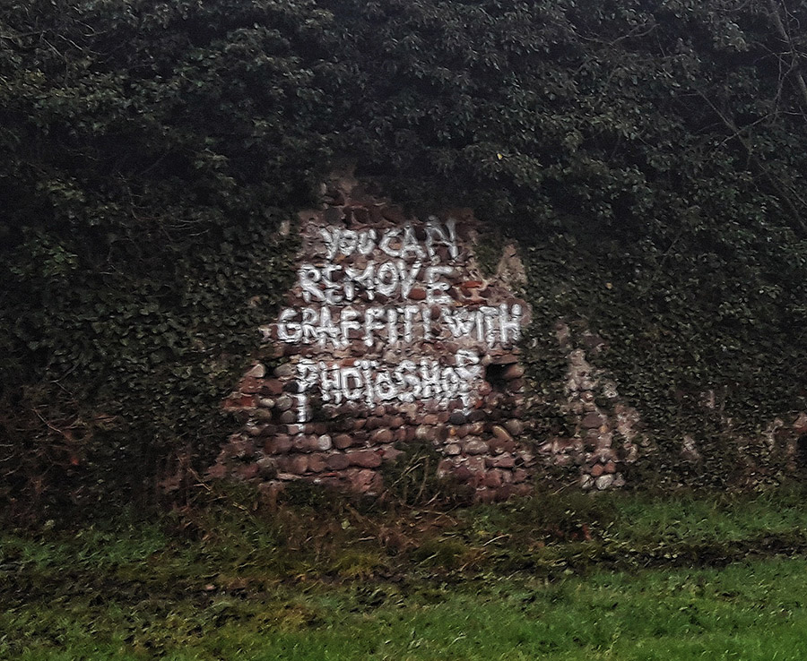 This photograph shows the phrase “You can remove graffiti with Photoshop” sprayed in plain white aerosol lettering on a wall in the countryside.