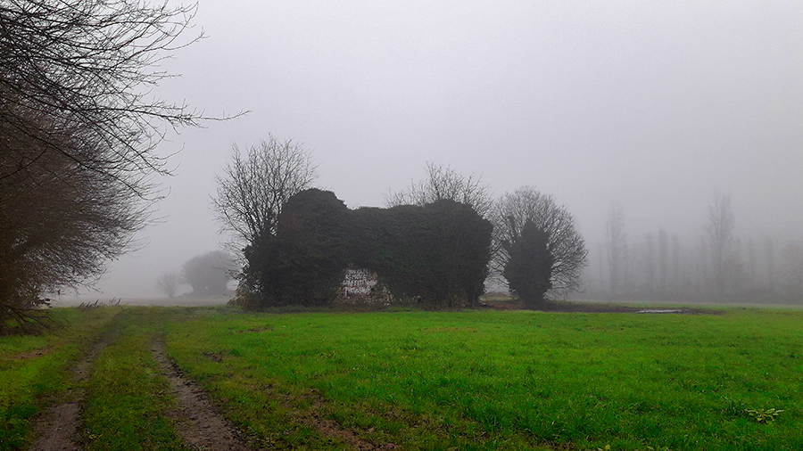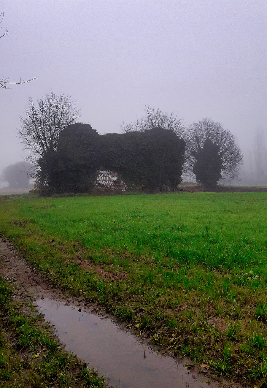Elfo isn’t wrong—but he isn’t quite right either. The statement hinges on where graffiti is most often encountered today: on brick and concrete, or on a glowing fluorescent rectangle in your hand. Conceptually, this is not a new kind of irony, but the choice of text and its placement sharpen the point. In a misty, ivy-covered scene like this, an Italian cow would have more jurisdiction than Photoshop.