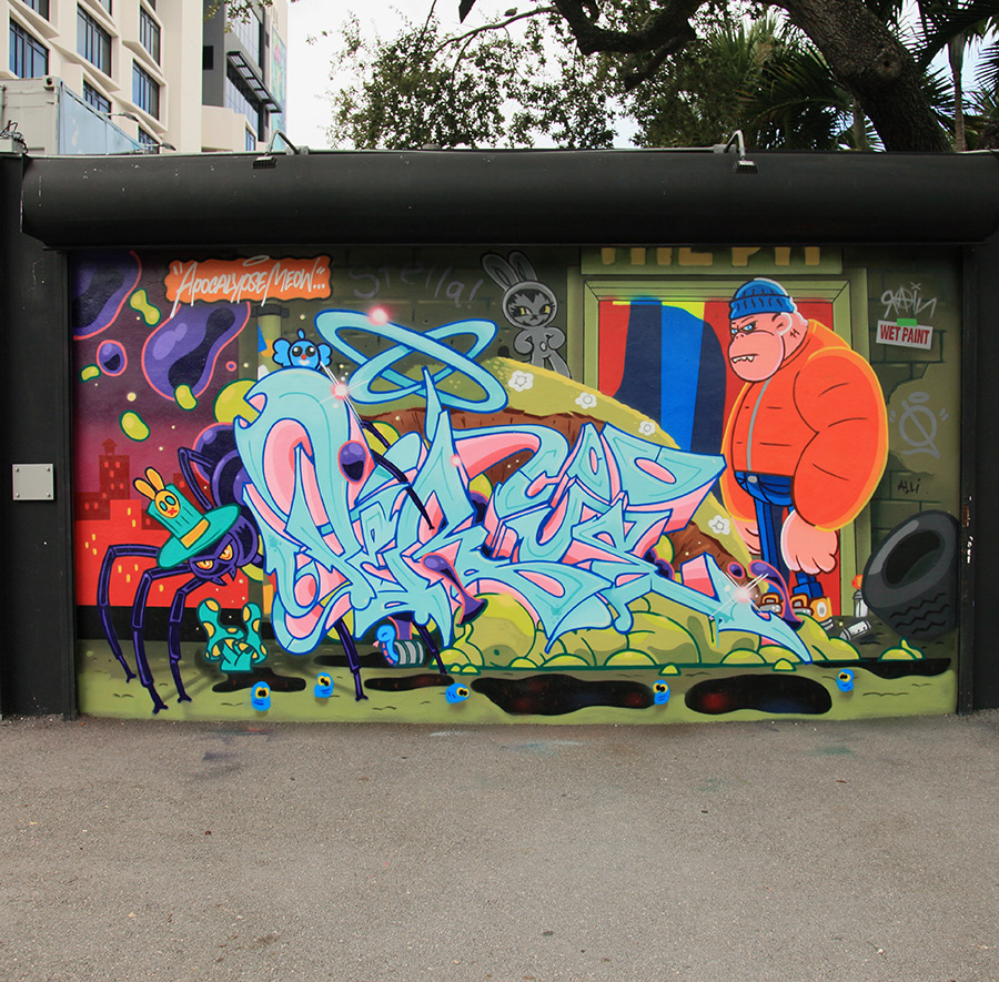 Persue, placing his BunnyKitty character into an apocalyptic scenario where graffiti mutates and color intensifies